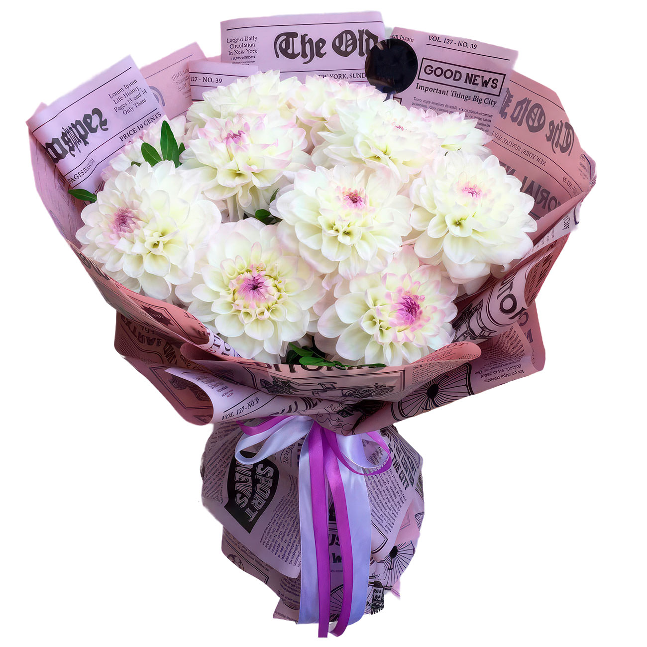 Этот букет дарит ощущение свежести благодаря белым георгинам, которые подчёркиваются зеленью эвкалипта и утончённостью стабилизированного аспарагуса. Всё это оформлено в стильную упаковку из газетной бумаги с розовым оттенком, дополненную лентой сиреневого цвета. Композиция создаёт атмосферу нежности и лёгкости. Идеально подойдёт для поздравления сестры на День знаний.