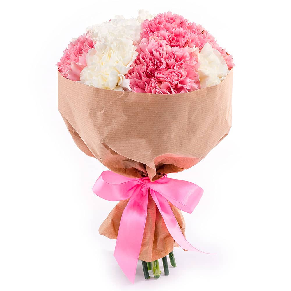 Этот нежный букет в бело-розовой гамме вызывает чувство лёгкости и радости. В его составе белые и розовые гвоздики, создающие гармоничное сочетание. Упакован в крафт-бумагу и украшен яркой розовой лентой, он выглядит стильно и современно. Композиция создаёт атмосферу утончённости и изысканности. Прекрасный выбор для поздравления с днём рождения или юбилеем близкого человека.