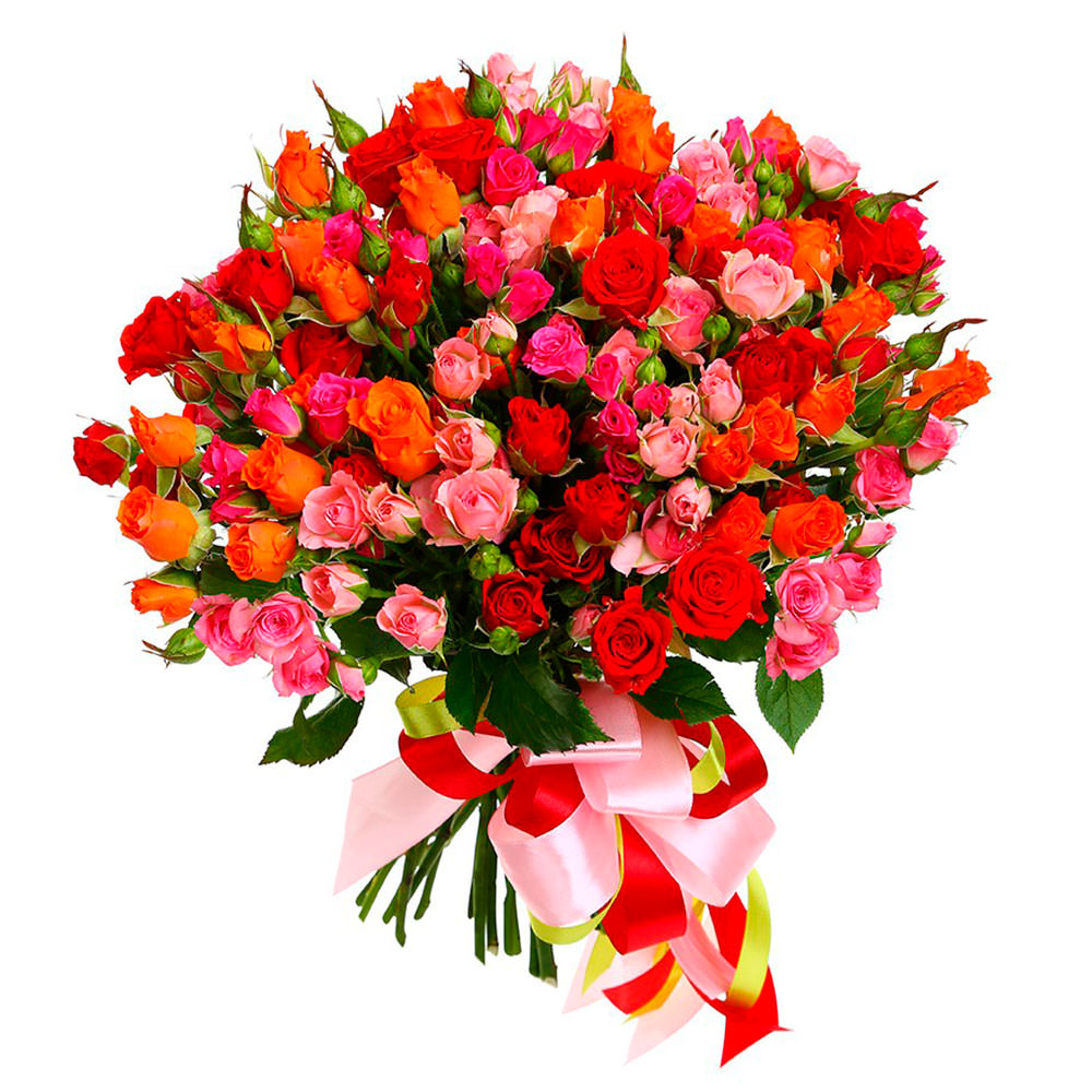 Яркие сочетания розовых, красных и оранжевых кустовых роз создают атмосферу радости и тепла. В букете собраны роза кустовая пышний микс: розовая, красная и оранжевая. Упаковка оформлена с использованием яркой ленты и матовой пленки, добавляющих изысканности. Эта композиция создаст атмосферу праздника. Идеально подойдет для поздравления подруги с её днём рождения.