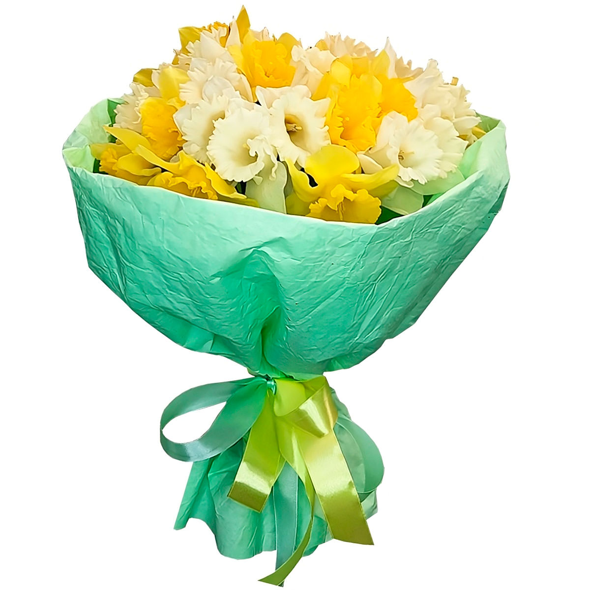 Яркие бело-жёлтые нарциссы создают атмосферу весенней свежести и радости. Букет оформлен в нежную зелёную бумагу и украшен атласной лентой зелёного оттенка. Эта композиция оживит любое пространство и станет идеальным подарком для учительницы на День знаний.