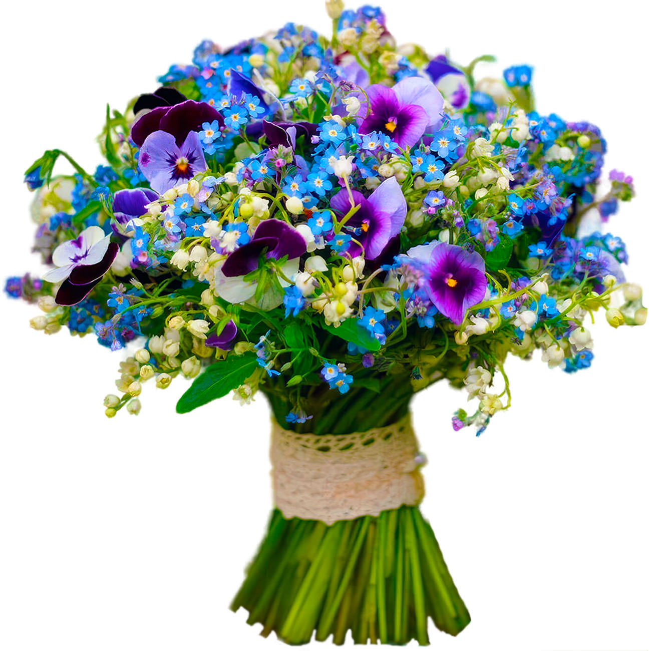 Этот букет создаёт атмосферу весенней свежести благодаря сочетанию фиолетовых анютиных глазок, нежных белых ландышей и голубых незабудок. Упакован в натуральную ленту, подчёркивающую природную красоту композиции. Создаёт атмосферу нежности и радости. Идеально подойдёт для поздравления мамы на День матери.