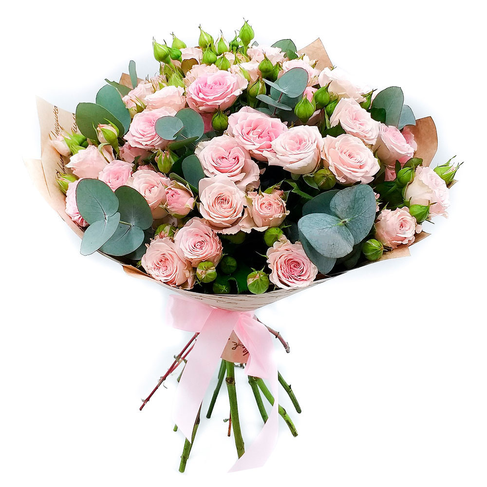 Очаровательный розовый оттенок кустовых роз в сочетании с насыщенной зеленью эвкалипта создают атмосферу нежности и утончённости. Букет оформлен в стильную крафт-бумагу и обвязан светло-розовой атласной лентой, добавляющей изысканности. Матовая пленка и декоративная сетка придают завершенность композиции. Этот букет станет отличным подарком для молодой мамы на выписку, даря светлые эмоции и радость.