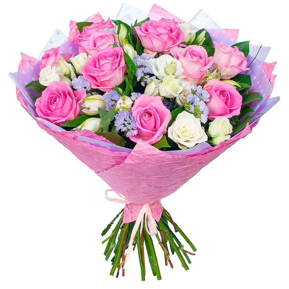 Яркое сочетание розовых и белых оттенков вызывает чувство нежности и радости. В букете собраны розовые одноголовые розы, белые альстромерии, белые кустовые розы и голубая статица. Композиция завернута в розовую матовую пленку и перевязана нежной лентой. Этот букет создаёт атмосферу романтики и подходит для встречи из поездки, чтобы порадовать любимую женщину.