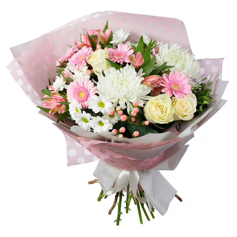 Нежные розовые и белые оттенки букета создают атмосферу легкости и утонченности. В состав входят кремовые розы, розовые герберы, белые кустовые и одноголовые хризантемы, розовая альстромерия и гиперикум. Упакован в матовую пленку и крафт-бумагу с рисунком, дополненную белой атласной лентой. Эта композиция привнесет радость на День семьи, любви и верности для коллеги.