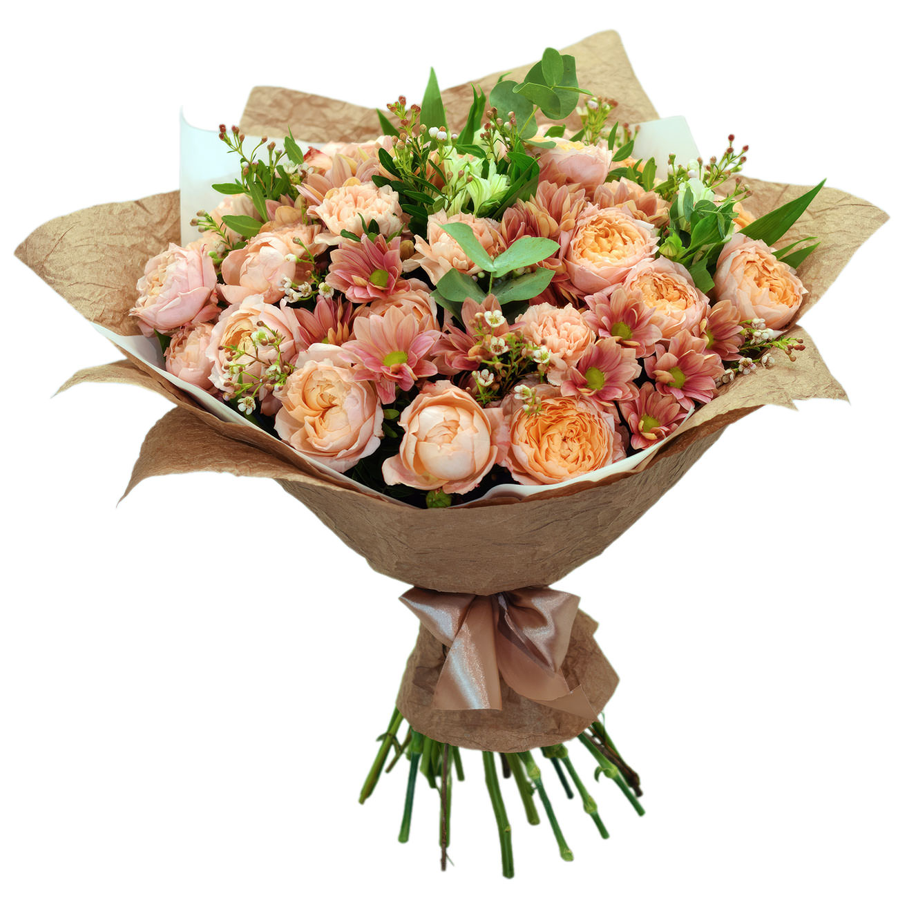 Теплые персиковые оттенки бутона вызывают ощущение нежности и гармонии. Композиция включает ваксфлауэр, персиковую хризантему, пионовидную персиковую розу и эвкалипт. Упакован в крафт-бумагу и матовую пленку, завязанную атласной лентой. Создает атмосферу уюта и романтики. Прекрасный подарок для мамы на 8 Марта.