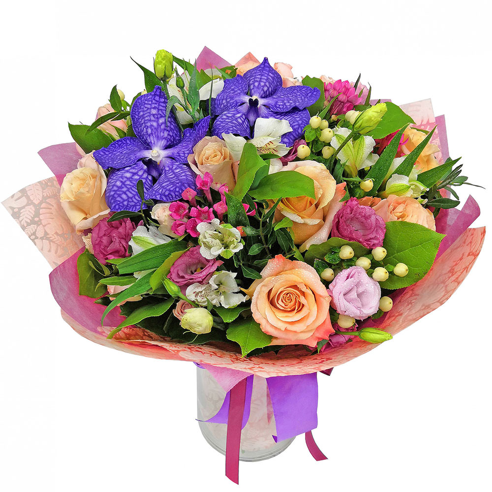 Эта яркая компоновка с сочетанием фиолетовых орхидей Ванда, белой альстромерии, гиперикума, персиковых роз, розовой эустомы и эвкалипта создаёт атмосферу лёгкости и свежести. Упакован в матовую плёнку с крафт-бумагой и декорирован лентой насыщенного фиолетового цвета. Букет наполняет пространство весенним настроением, идеально подходя для романтического вечера. Подарок, который покорит сердце любимого человека.
