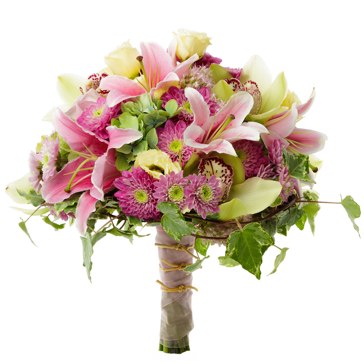 Лилия розовая, хризантема кустовая розовая, орхидея желтая, гортензия зеленая, эустома белая, плющ. Упаковка (лента, пленка, крафт, сетка, пленка матовая)