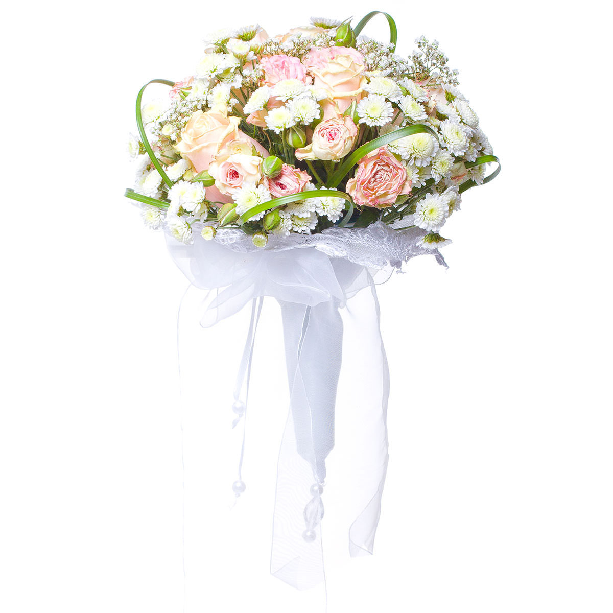 Роза одноголовая кремовая, роза пионовидная кустовая розовая, хризантема кустовая мини белая, гипсофила, зелень. Упаковка (лента, пленка, крафт, сетка, пленка матовая)