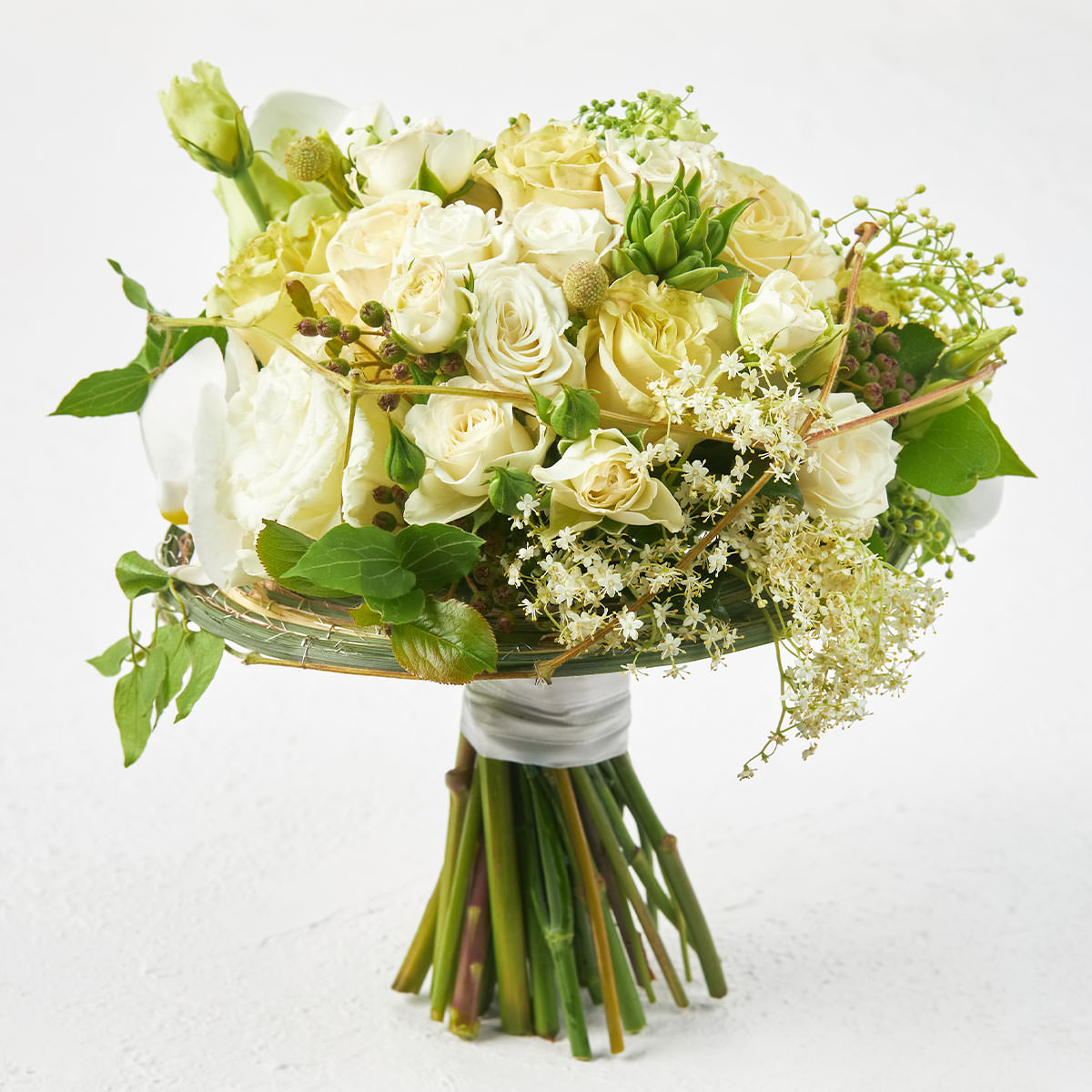 Роза кустовая белая, эустома белая, озотамнус, клематис белый, зелень. Упаковка (лента, пленка, крафт, сетка, пленка матовая)