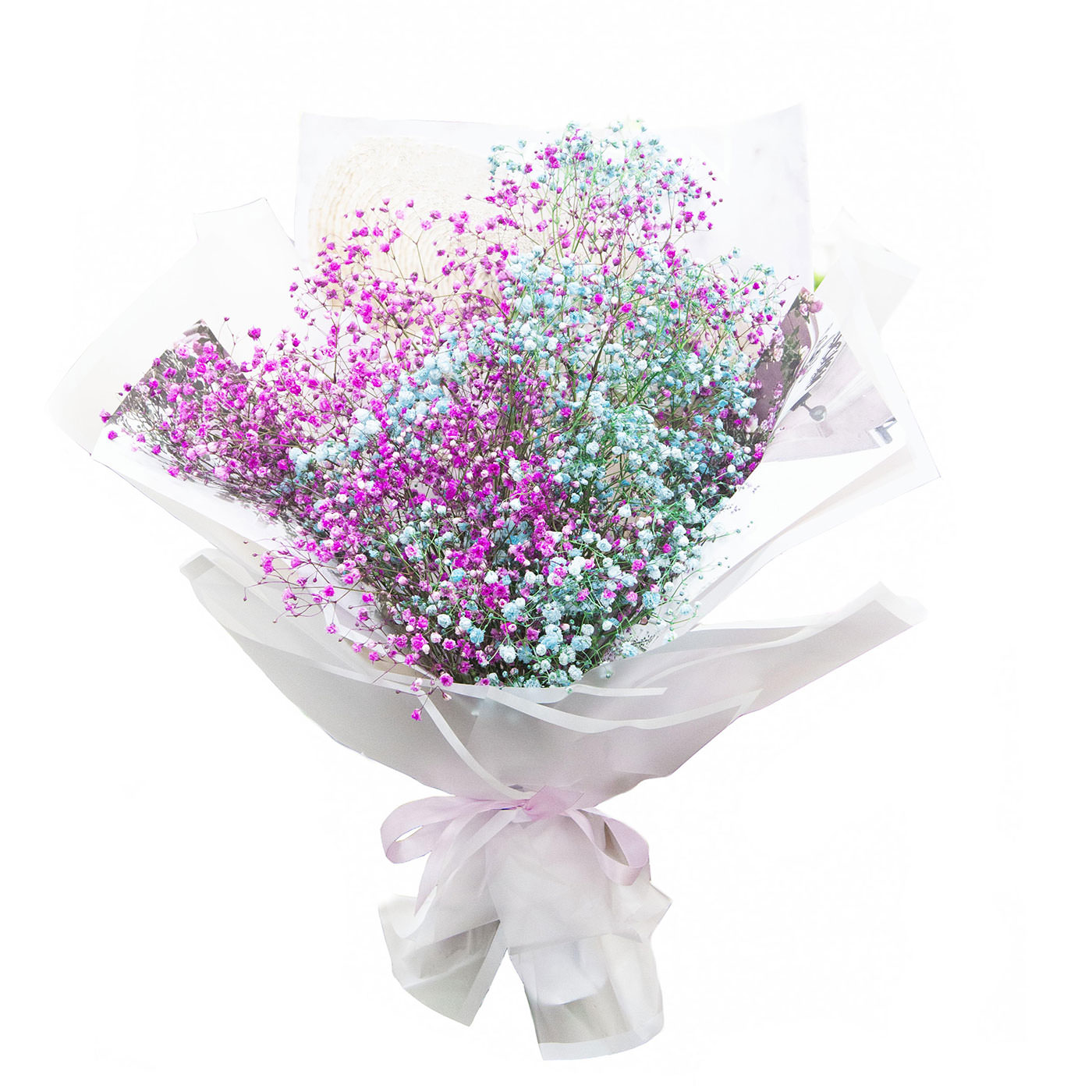 Свежесть фиолетового и зелёного цветов гипсофилы создаёт воздушную и нежную атмосферу. В состав входят гипсофила фиолетовая и зеленая. Букет оформлен в белую матовую пленку и перевязан атласной лентой, что придаёт ему изысканный вид. Композиция создаёт романтичное настроение и станет отличным выбором на День Святого Валентина для девушки.