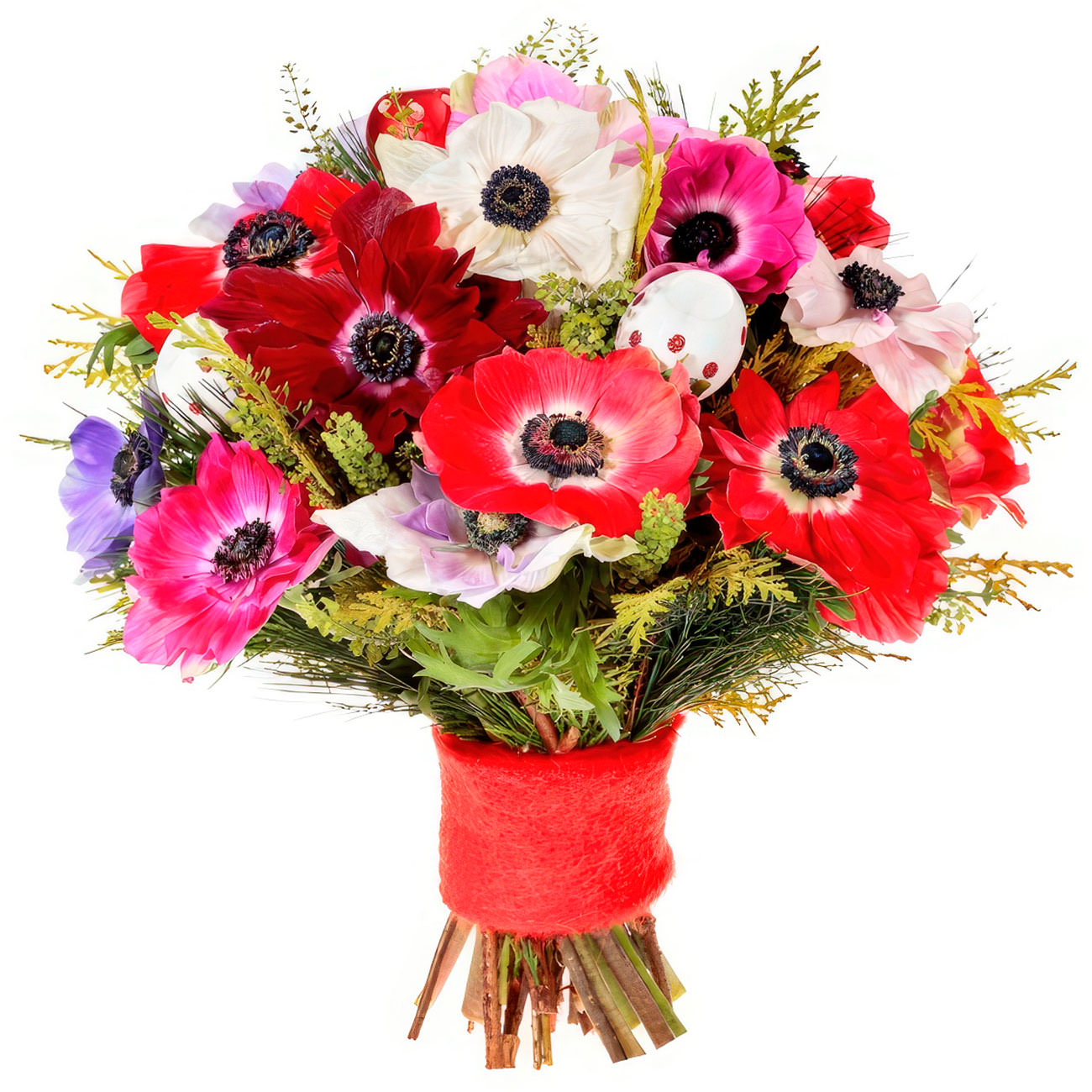 Яркие оттенки красного, белого, розового и сиреневого мака создают атмосферу весенней свежести. Букет включает красные, белые, розовые и сиреневые маки. Упакован в красную фетровую ленту, что добавляет завершённости композиции. Прекрасно подойдёт для создания праздничного настроения на выпускном вечере. Идеальный подарок для подруги.