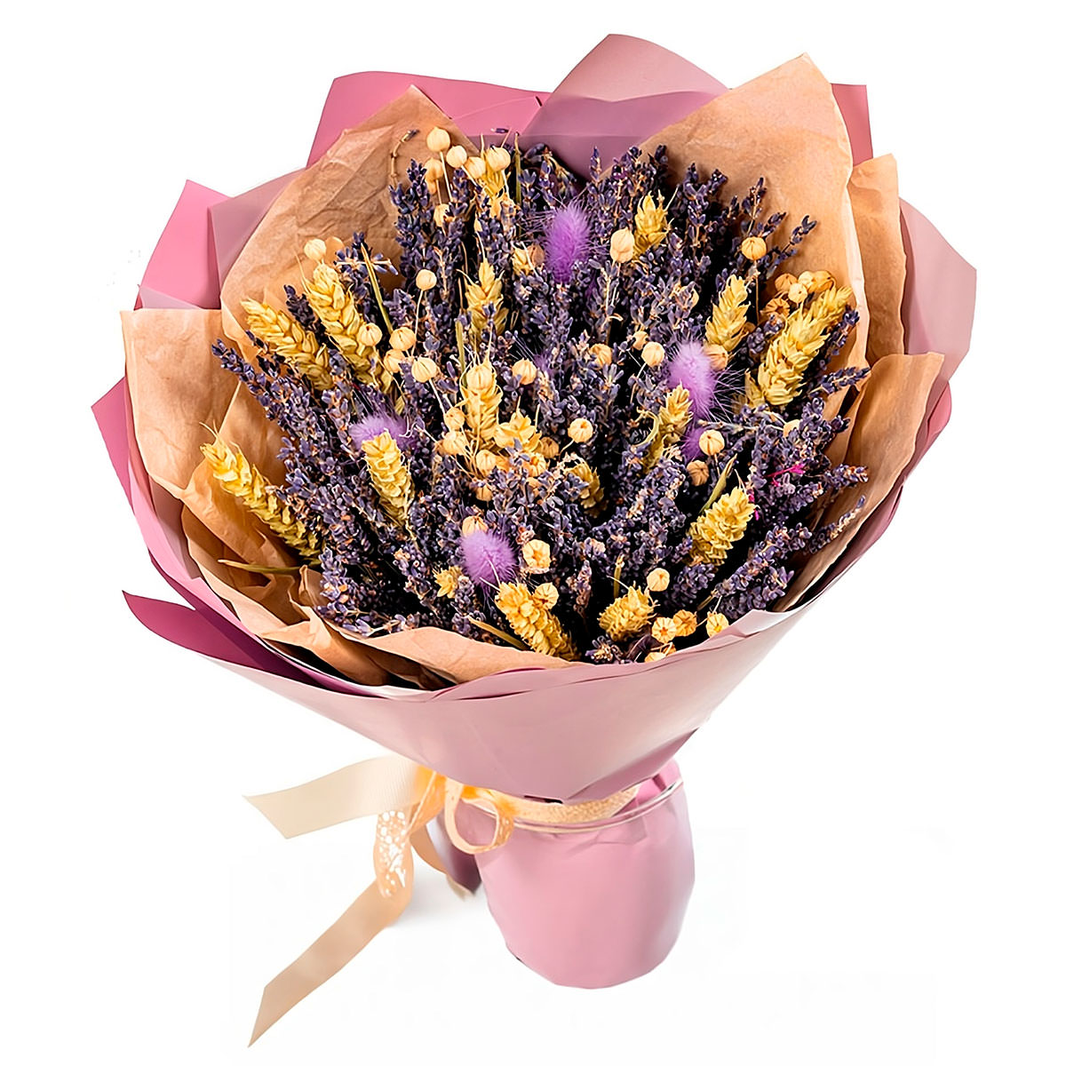 Яркий букет в золотисто-фиолетовых тонах подарит ощущение уюта и тепла. Композиция включает в себя лагурус, лаванду и пшеницу. Упакован в нежную крафт-бумагу с розовой матовой плёнкой и дополнен светло-бежевой атласной лентой. Создает атмосферу спокойствия и романтики. Идеально подходит для подарка руководительнице на юбилей.