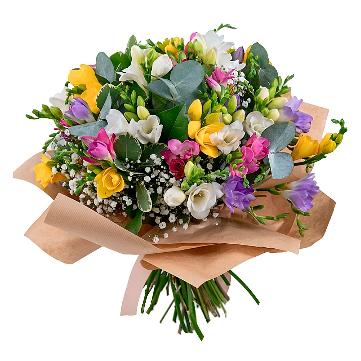 Этот букет из фрезий различных оттенков, гипсофилы и эвкалипта создаёт радостное и яркое впечатление. Все цветы гармонично сочетаются с зеленью, а упаковка из крафт-бумаги подчёркивает их естественную красоту. Композиция создаёт атмосферу лёгкости и вдохновения. Подойдёт для поздравления подруги на юбилей.
