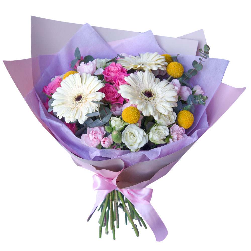 Этот букет дарит легкость и свежесть белых гербер и роз, дополненных яркими розовыми кустовыми розами и зеленью эвкалипта. Композицию завершают нежные белые и розовые хризантемы кустовые. Упакован в матовую пленку нежно-розового цвета и перевязан атласной лентой. Такой букет создаёт атмосферу романтики и легкости. Идеально подойдёт для поздравления учительницы на День знаний.