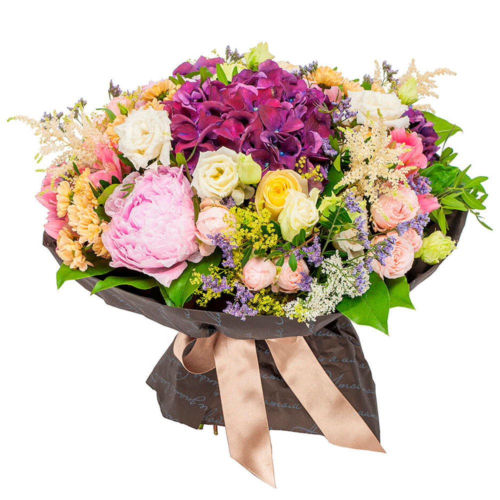 Этот букет завораживает нежными оттенками сиреневого, розового и желтого. В его состав входят сиреневая гортензия, розовый пион, нежно-розовая кустовая роза, светло-желтая одноголовая роза, персиковая кустовая хризантема, астильба и зелень. Упакован в матовую пленку и крафт-бумагу, украшен нежной текстильной лентой. Композиция создаёт атмосферу весны и радости, идеально подходит на выпускной вечер для молодой мамы.