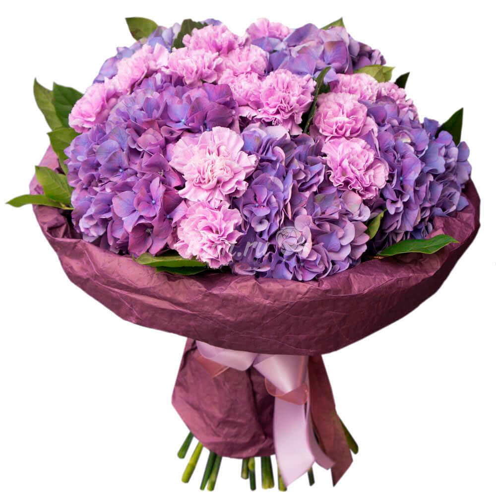 Восхитительная палитра фиолетового и сиреневого создает атмосферу нежности. В состав входят фиолетовая гортензия, сиреневая гвоздика и зелень. Упаковка выполнена из крафтовой бумаги насыщенного винного оттенка с матовой текстурой, дополнена нежной атласной лентой. Букет привнесет романтику в ваш вечер и станет идеальным подарком для любимой женщины на годовщину.