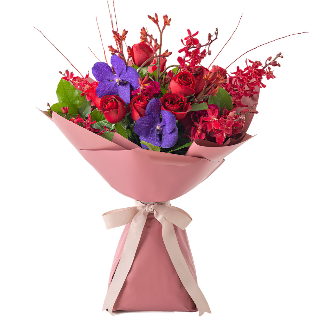 Яркие красные и фиолетовые оттенки создают атмосферу страсти и экзотики. В состав букета входят роза кустовая красная, орхидея Ванда, азима, гвоздика розовая и цветущий кизил. Упакован в матовую плёнку розового цвета, перевязанную кремовой лентой. Эта композиция добавит романтики в любой вечер, идеально для свидания или романтического ужина с любимой.
