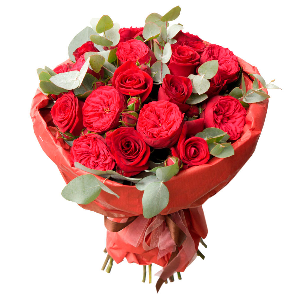 Яркий алый цвет букета создаёт атмосферу страсти и тепла. В состав входят пурпурные пионовидные розы, одноголовые красные розы и эвкалипт. Упаковка выполнена из матовой плёнки и крафт-бумаги, дополненная сеткой и ленточкой. Эта композиция дарит ощущение праздника и подходит для поздравления начальника на юбилей.