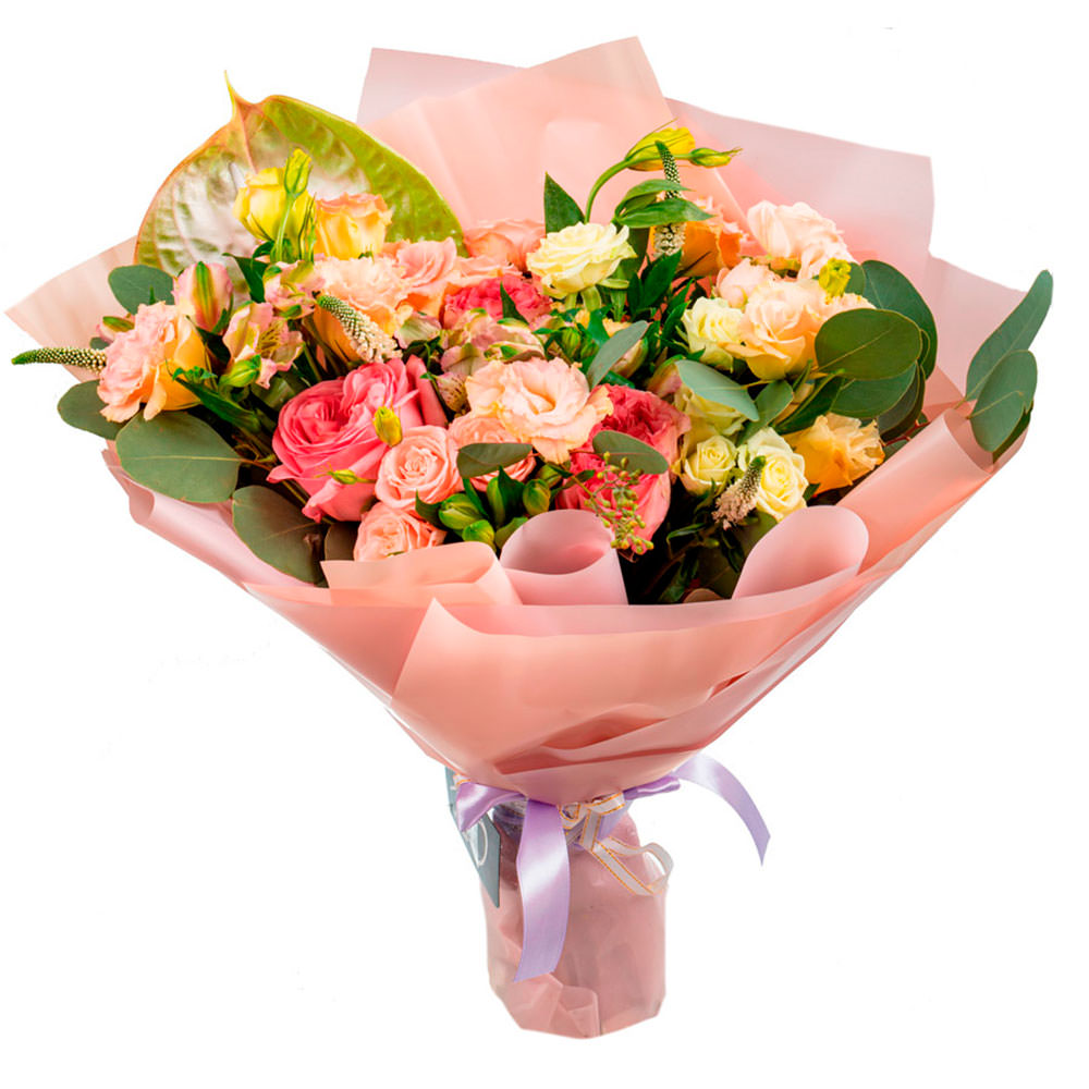 Потрясающая розовая гамма букета вызывает чувство нежности и радости. В композиции использованы розовая одноголовая роза, розовая эустома, кремовая кустовая роза, эвкалипт, вероника и экзотическая зелень. Упакован в матовую розовую плёнку, украшен атласной лентой. Создает атмосферу романтики и изысканности. Подойдет для поздравления начальницы с профессиональным праздником.
