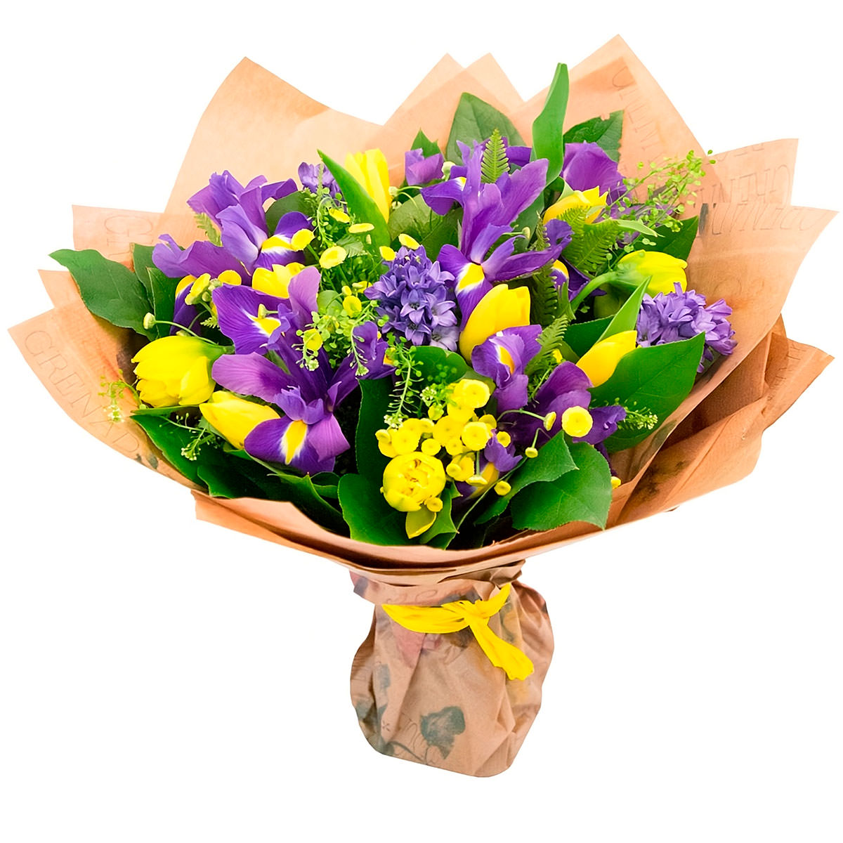 Яркий и жизнерадостный букет с жёлтыми нарциссами, фиолетовыми ирисами и гиацинтами. Каждый цветок гармонично сочетается в оформлении, обёрнутом в крафт-бумагу с аккуратной жёлтой лентой. Этот букет создаёт атмосферу свежести и весеннего настроения. Идеально подойдёт для поздравления секретаря на День учителя.