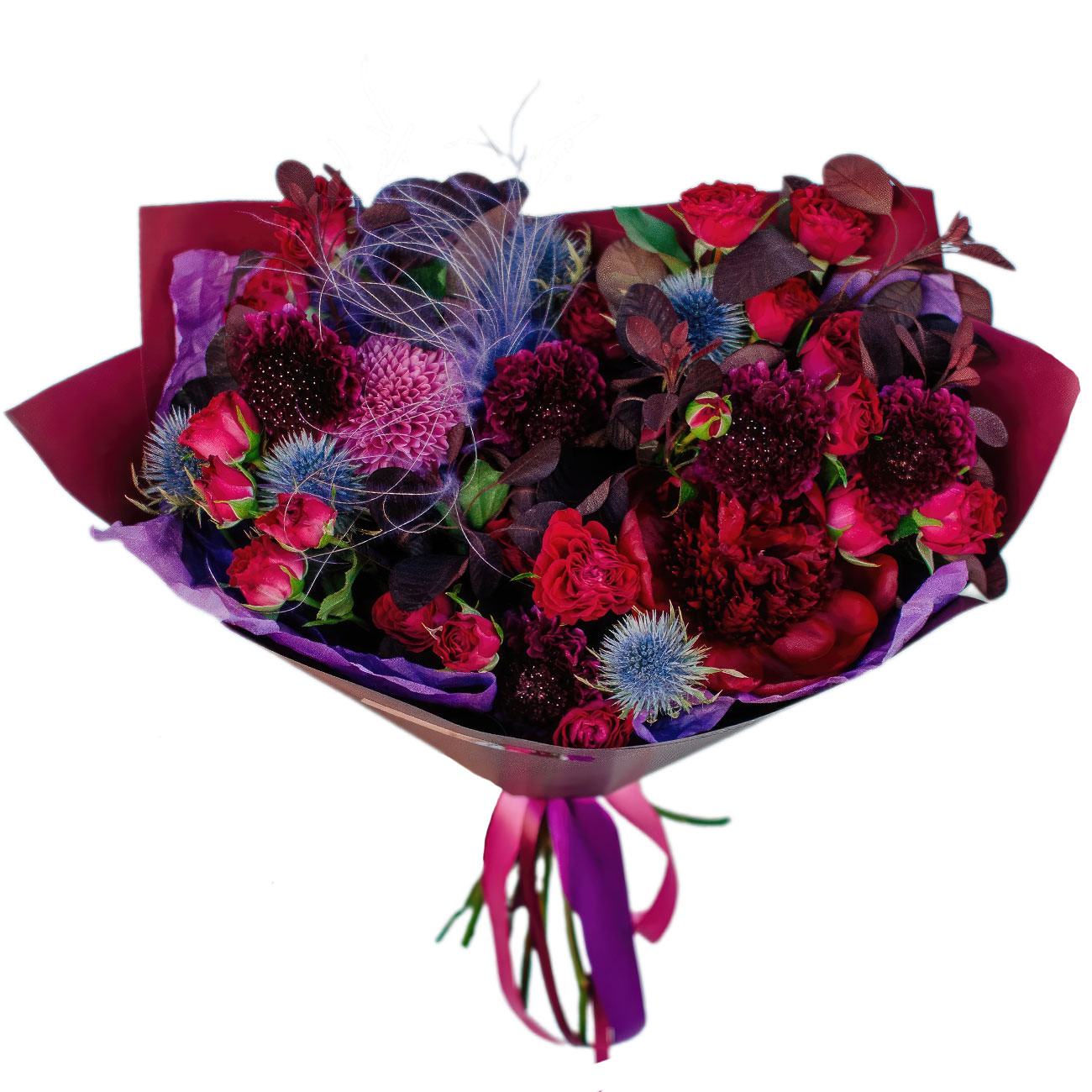 Яркие бордовые и красные оттенки создают атмосферу страсти и энергии. В составе: эрингиум, красная кустовая роза, скабиоза, бордовая гвоздика, зелень и декоративные перья. Упакован в матовую пленку с яркой лентой, подчеркивающей насыщенность цветов. Подойдет для поздравления молодожёнов на свадьбу.