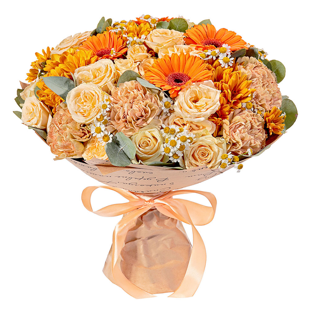 Светлые кремовые и яркие оранжевые оттенки наполняют букет атмосферой радости. В составе одноголовая кремовая роза, оранжевая гербера, жёлтая кустовая хризантема, нежные ромашки, кремовая гвоздика и эвкалипт. Упакован в крафт-бумагу с изящным рисунком и перевязан нежной атласной лентой, создавая элегантный вид. Эта композиция приносит тепло и радость в любой дом. Идеально подойдёт для любимого мужчины на золотую свадьбу.