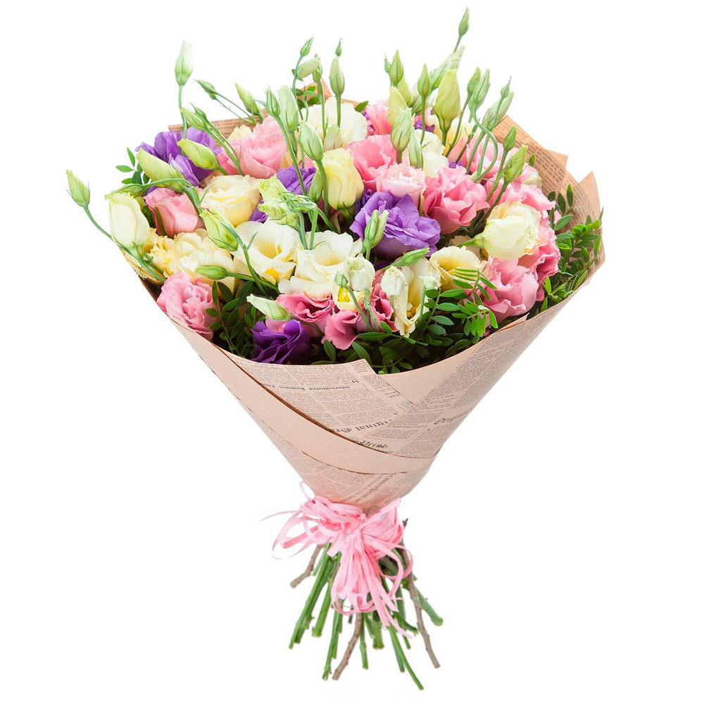Яркий микс белых, розовых и сиреневых лизиантусов в сочетании с свежей фисташкой создают атмосферу нежности и утонченности. Букет обернут в крафт-бумагу с газетным принтом, дополняется розовой лентой. Эта композиция привнесет романтическое настроение на свидание и станет прекрасным подарком для любимой женщины.