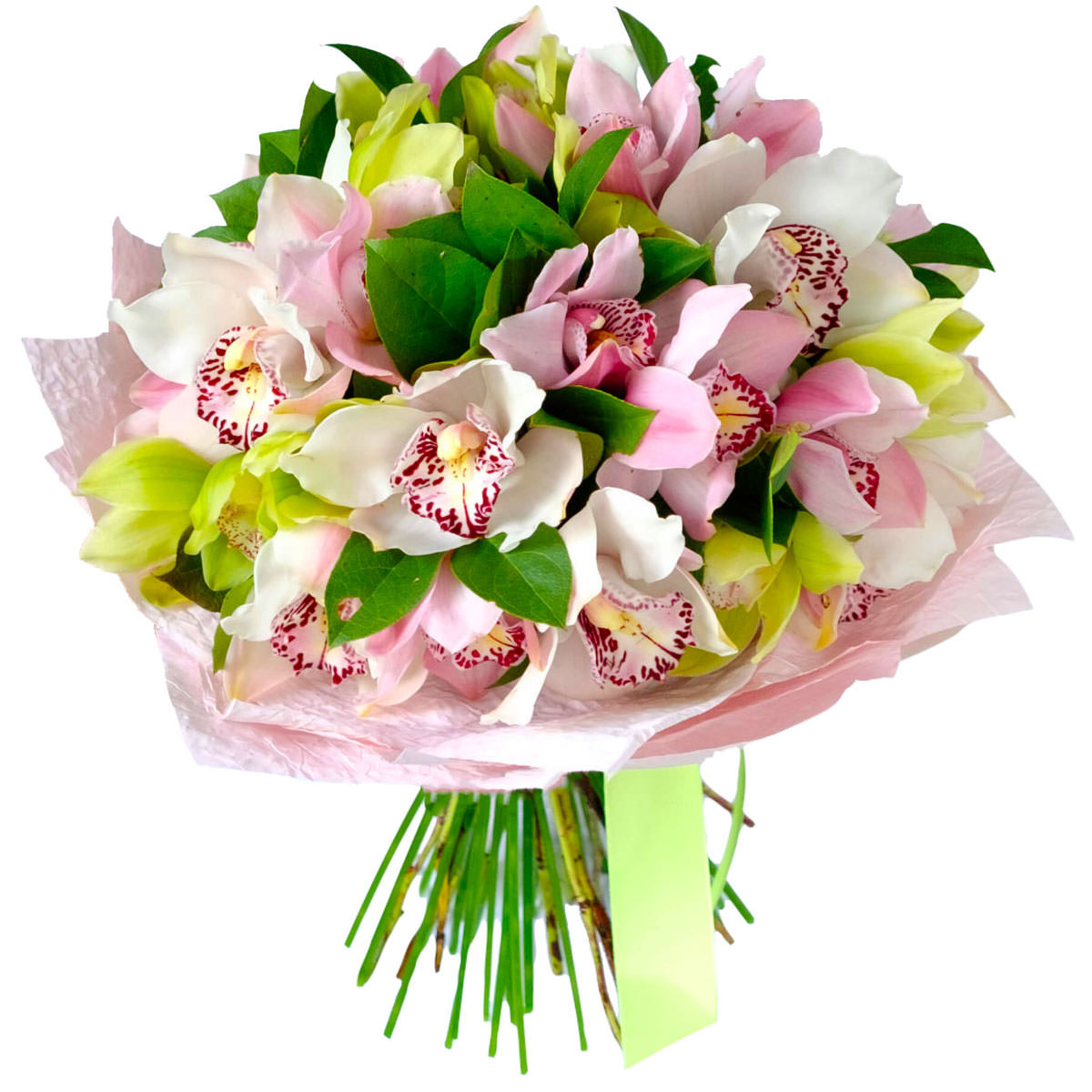 Орхидея ассорти из белой, розовой и зеленой можно купить с бесплатной круглосуточной доставкой в Архангельске по цене за 300 руб. Только свежайшие цветы. Уже 40 дизайнов упаковок. Букеты упаковывают более 110 флористов.