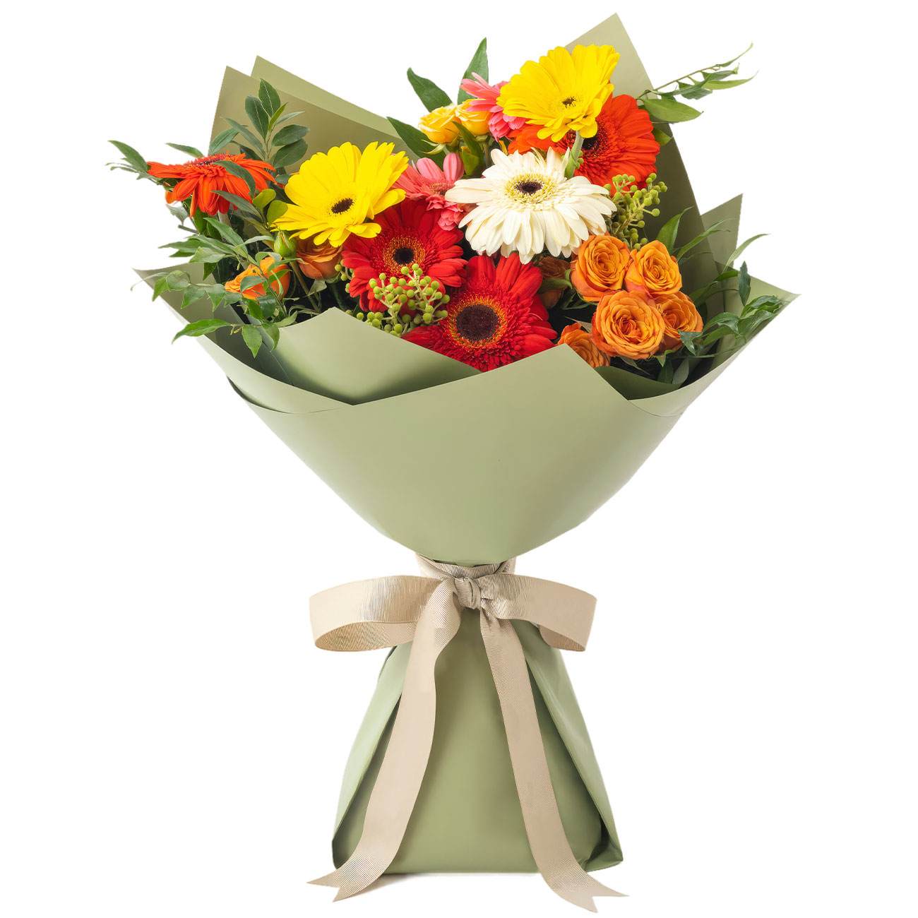 Яркие оттенки красных, желтых и белых гербер гармонируют с оранжевыми кустовыми розами, создавая радостное настроение. Букет дополнен салалом, фисташкой и зеленью. Упакован в стильную матовую пленку и декорирован атласной лентой. Эта композиция создаёт атмосферу праздника и идеально подойдёт для поздравления любимой женщины на День Святого Валентина.
