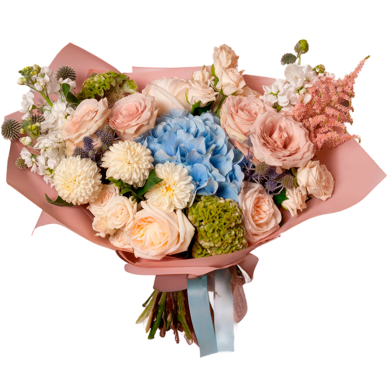 Нежные кремовые оттенки и голубая гортензия создают атмосферу утонченной элегантности. В букете представлены кремовые георгины, одноголовые и кустовые розы, голубая гортензия, астильба, белая маттиола и декоративная зелень. Упакован в розовую матовую пленку и перевязан атласной лентой. Этот букет создаст атмосферу праздника на новоселье и порадует вашу любимую женщину.