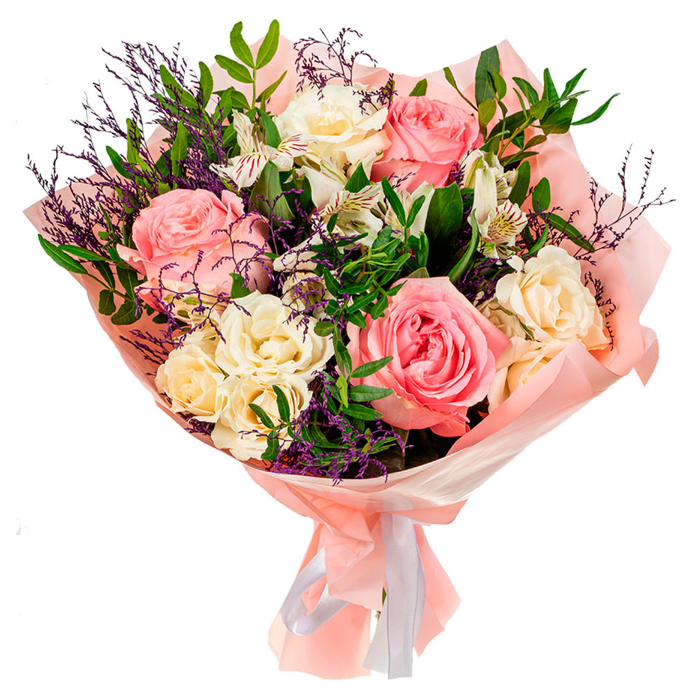 Этот букет приносит ощущение свежести и утончённости благодаря мягким оттенкам розовых и белых роз. В его состав входят роза одноголовая розовая, роза кустовая белая, альстромерия белая, лимониум и зелень. Упакован в матовую плёнку с розовым оттенком, перевязанную белой атласной лентой. Композиция создаёт атмосферу нежной романтики, идеально подходя для поздравления любимой на годовщину.
