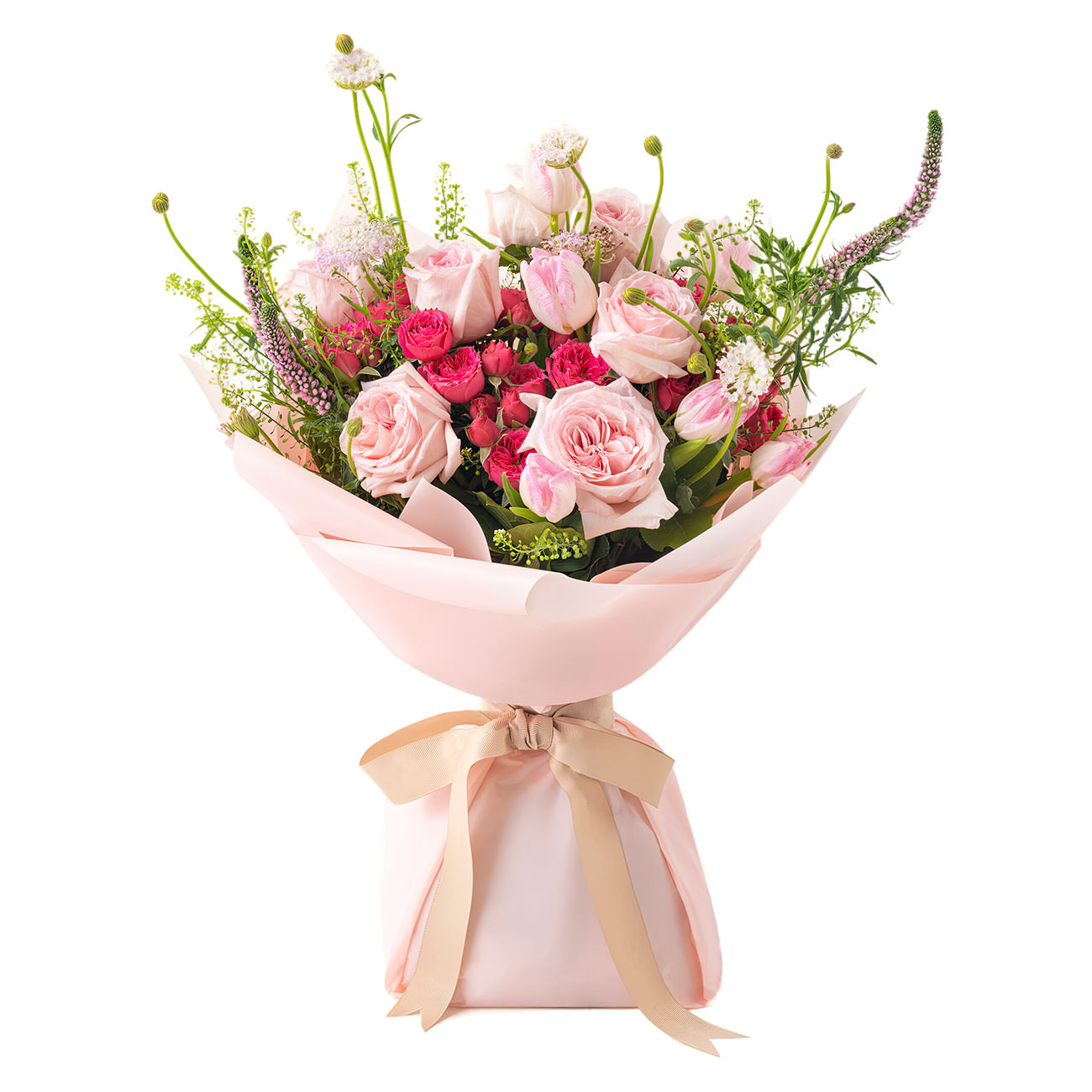Эта композиция дарит ощущение легкости и романтики, благодаря нежно-розовой палитре. В букете собраны роза пионовидная нежно-розовая, роза кустовая розовая кенийская, розовый тюльпан, шалфей, вероника и пеннисетум. Упакован в матовую плёнку розового оттенка и перевязан атласной лентой. Создает атмосферу нежности и идеально подходит на юбилей для подруги.