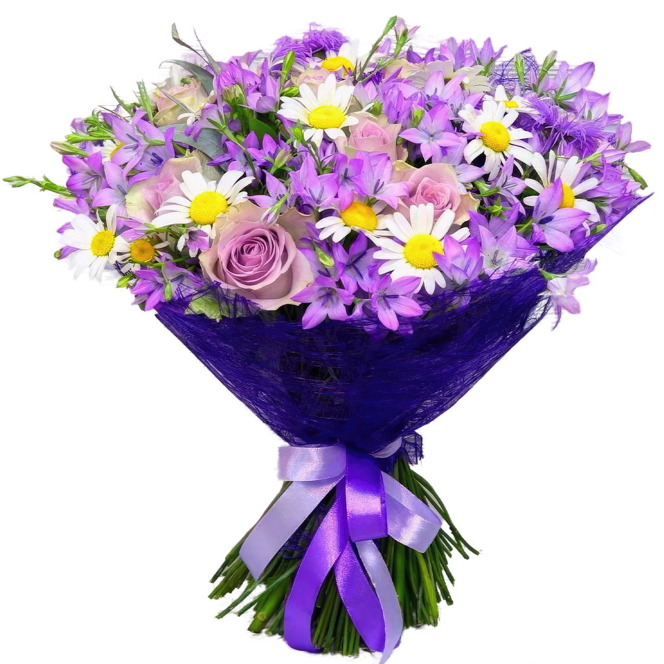 Этот букет окутает атмосферой нежности и спокойствия, благодаря сиреневым и белым оттенкам. В составе букет украшен колокольчиками, сиреневыми розами и ромашками. Упаковка выполнена из фиолетовой декоративной сетки и дополнена яркой атласной лентой. Композиция создаёт романтическое настроение и идеально подходит для подарка любимой женщине на годовщину.