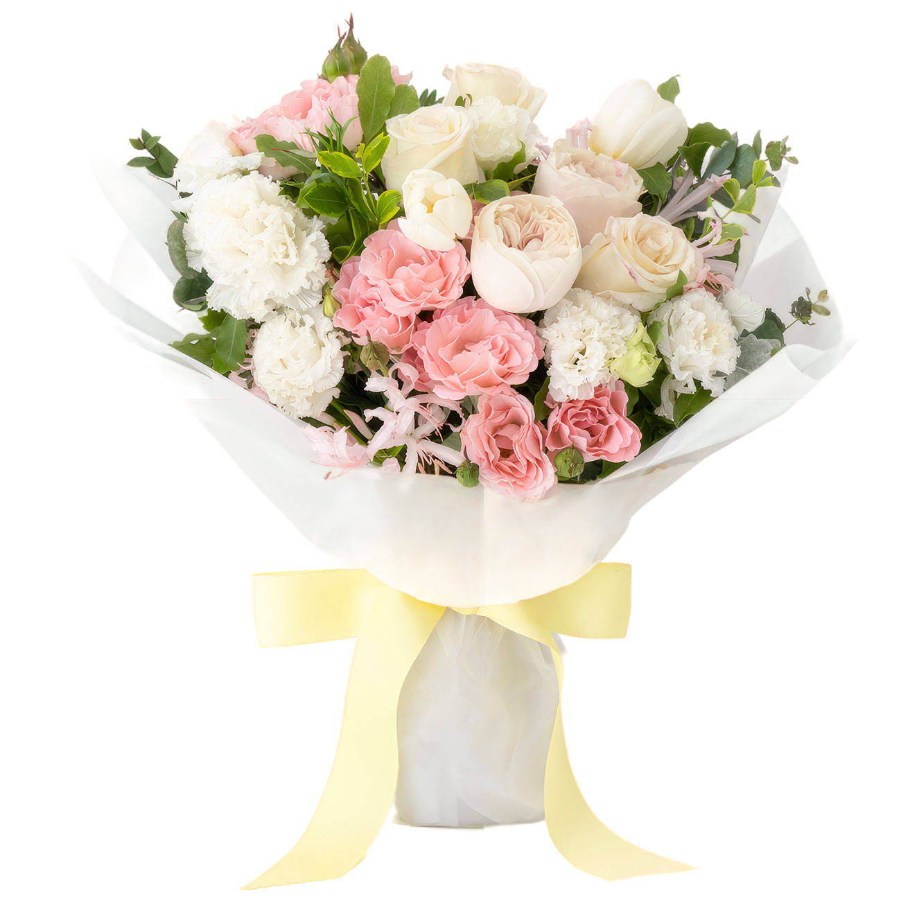Нежные белые и розовые оттенки букета создают атмосферу утончённой элегантности. В составе композиции белые пионовидные и одноголовые розы, тюльпаны, кустовые розовые розы, белая эустома, салал и эвкалипт. Букет оформлен в матовую плёнку с широкой жёлтой лентой. Такая композиция идеально подойдёт для поздравления коллеги с повышением и порадует начальника.