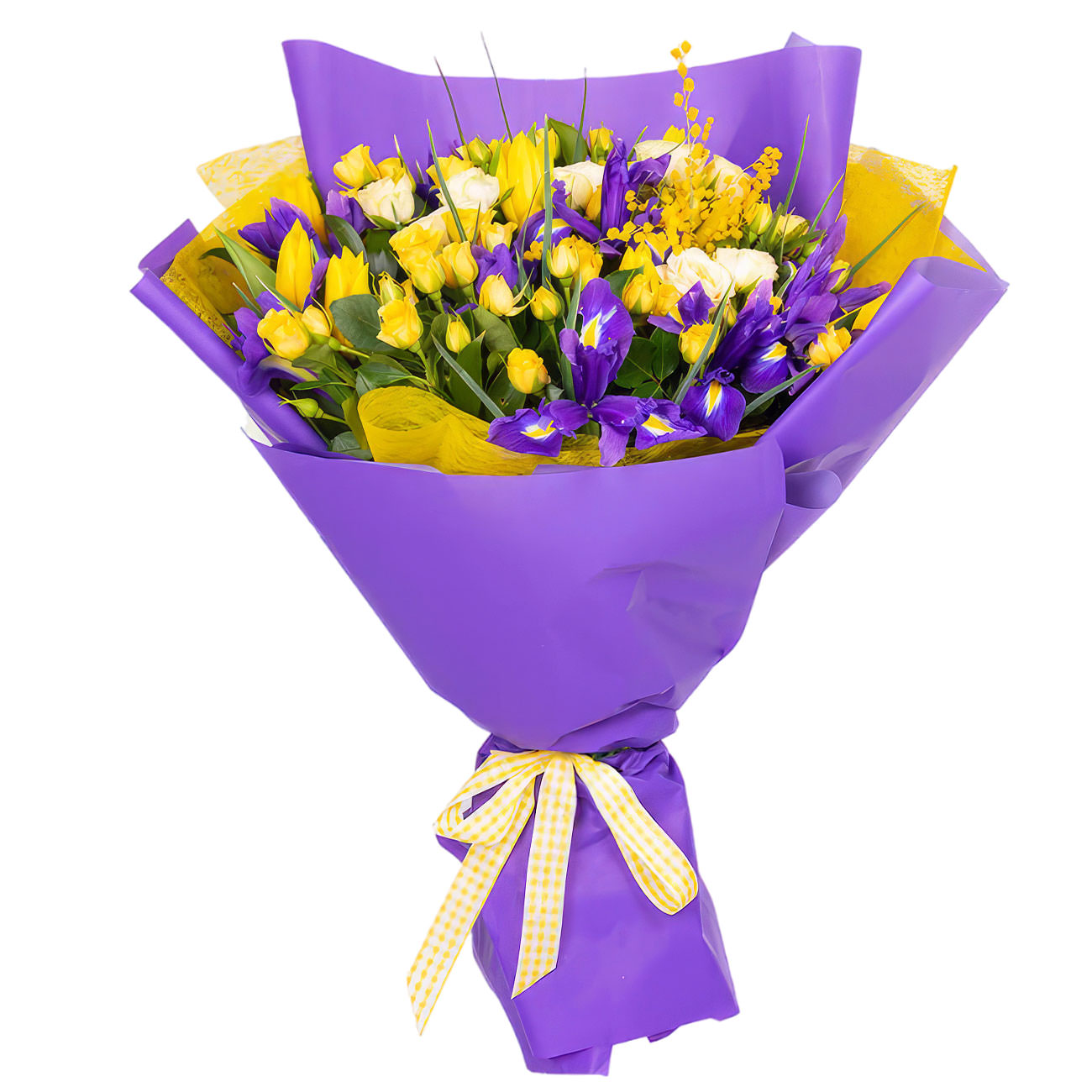 Яркость и контрастность: жёлтые и белые кустовые розы, жёлтые тюльпаны, мимоза и фиолетовые ирисы создают уникальную композицию. Букет обёрнут в насыщенно фиолетовую матовую плёнку и украшен жёлтой лентой в клетку. Эта красочная композиция придаст радости и свежести любому событию. Идеально для вручения на День Святого Валентина для любимой женщины.