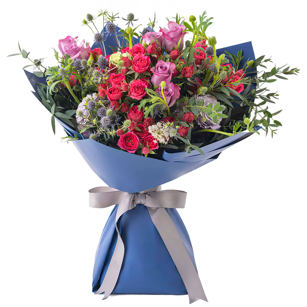 Этот букет завораживает сочетанием фуксиевых и розовых кенийских роз, белой эустомы, ананасового цветка и зелени. Композиция дополнена эрингиумом, создающим контраст. Упакован в синюю матовую пленку с изящной серой лентой. Создает атмосферу нежности и изысканности, идеален для поздравления крестной на благодарность учителю.