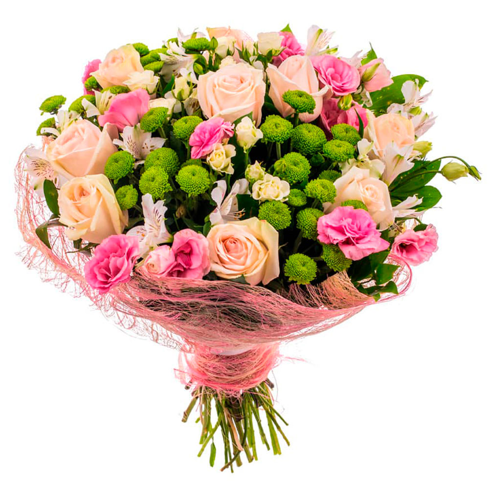 Этот букет поражает нежностью сочетания кремовых и розовых оттенков. В его состав входят одноголовые кремовые розы, кустовые кремовые розы, зеленые кустовые хризантемы, нежно-розовые альстромерии и розовые эустомы. Упакован в розовую декоративную сетку, что придает ему воздушность и легкость. Создаёт атмосферу романтики и нежности. Прекрасный подарок для подруги на юбилей.